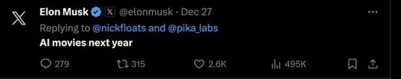 图注:2023年11月27日 Pika 爆火后,马斯克预判称明年将是“人工智能电影”元年