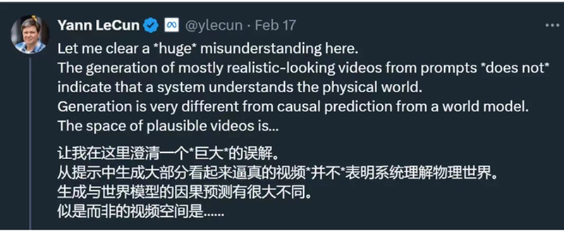 杨立昆在海外社交媒体发表见解,否认 Sora 能够理解物理世界