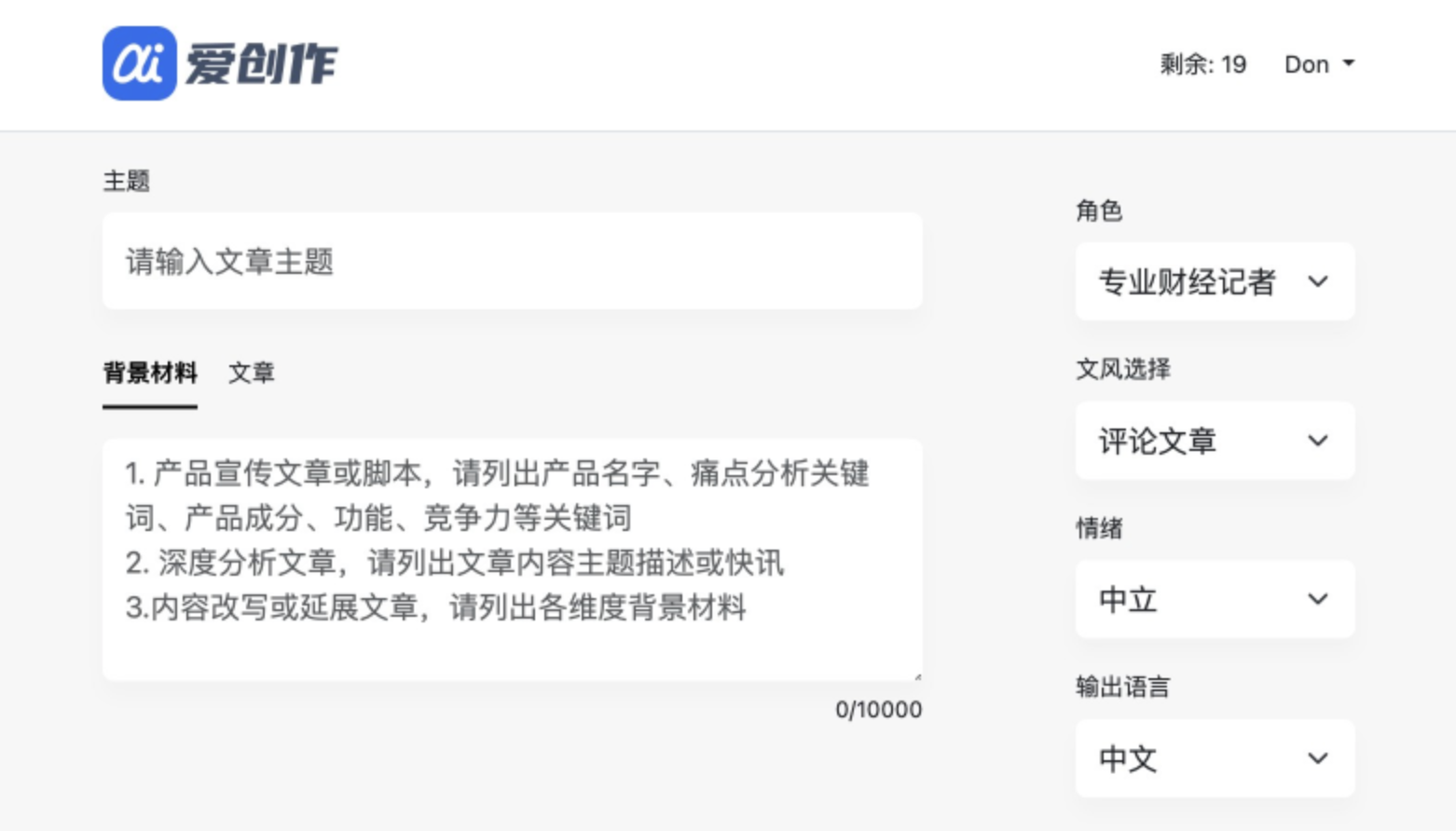 爱创作的操作非常简单,用户只需要几个步骤便可以使用该AI写作工具进行内容创作: