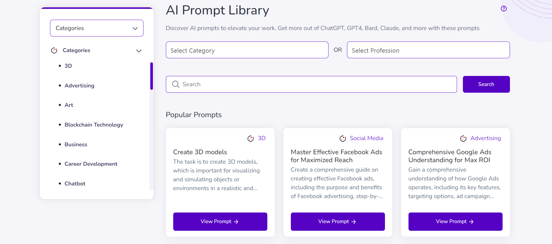 AI提示库 探索 AI 提示来提升您的工作水平。 通过这些提示,更多地了解 ChatGPT、GPT4、Bard、Claude 等