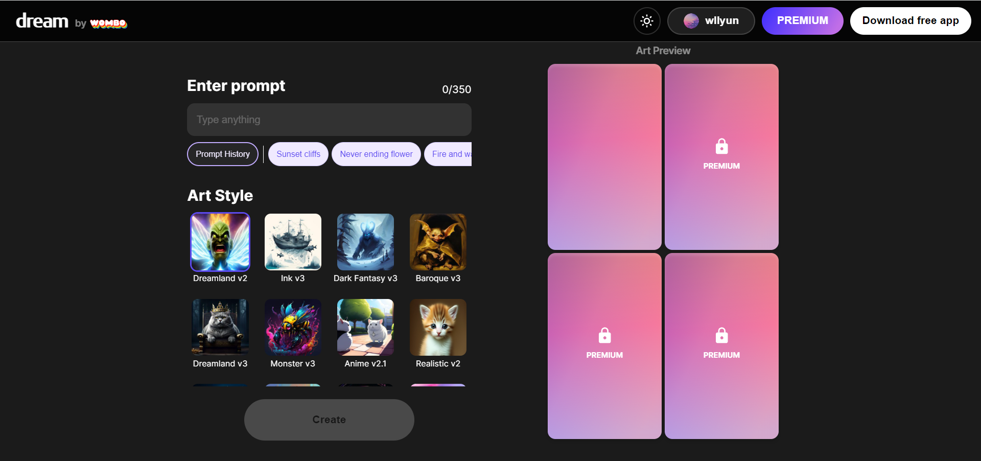 输入一个提示词,选择一种艺术风格,然后 WOMBO Dream 在几秒钟内便可以将你的想法变成一幅由 AI 驱动的绘画,快使用 AI 的力量来创作精美的艺术品吧!