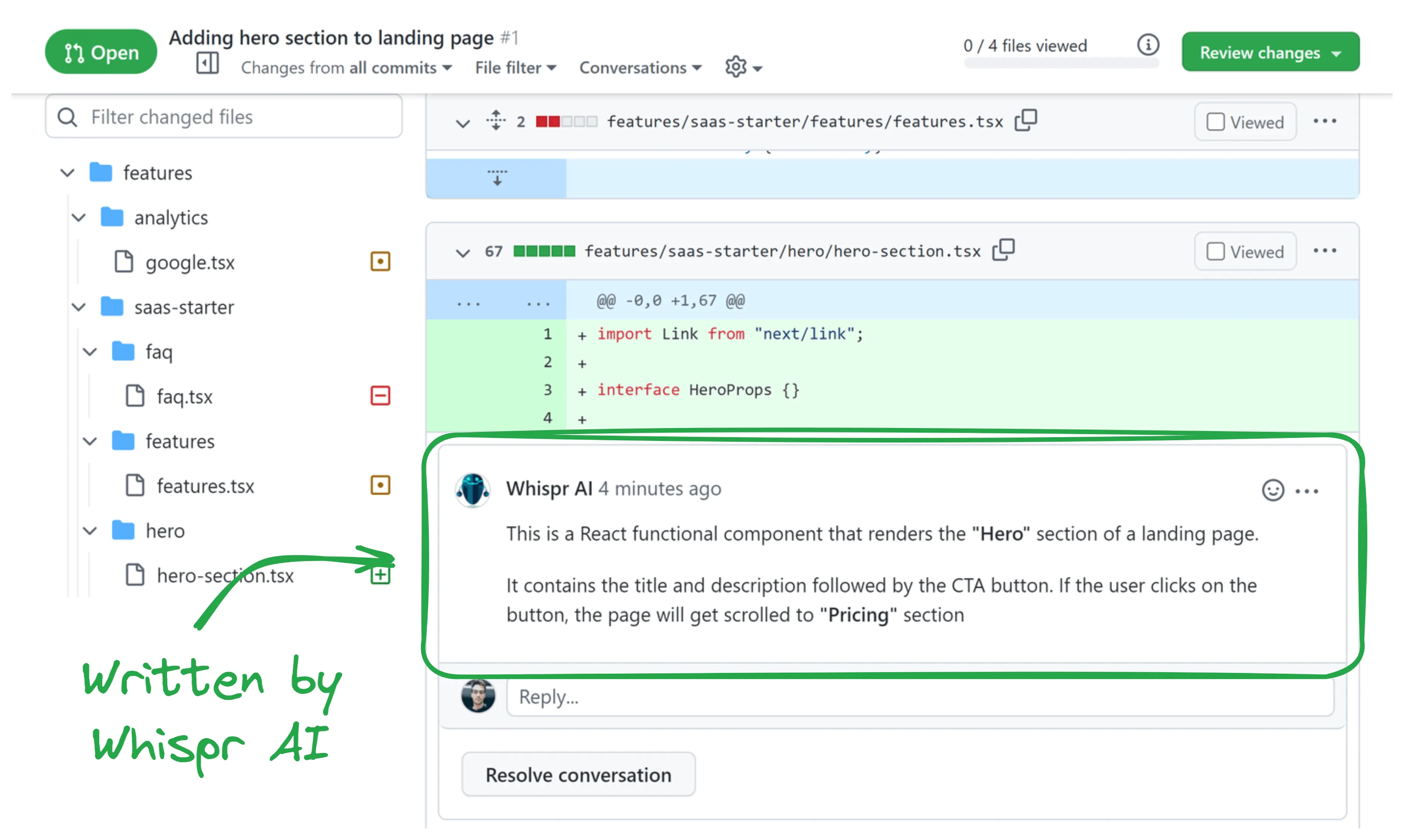 Whispr是一款使用人工智能代码审查助手节省时间。 打开拉取请求并在几秒钟内获取代码更改的摘要。
